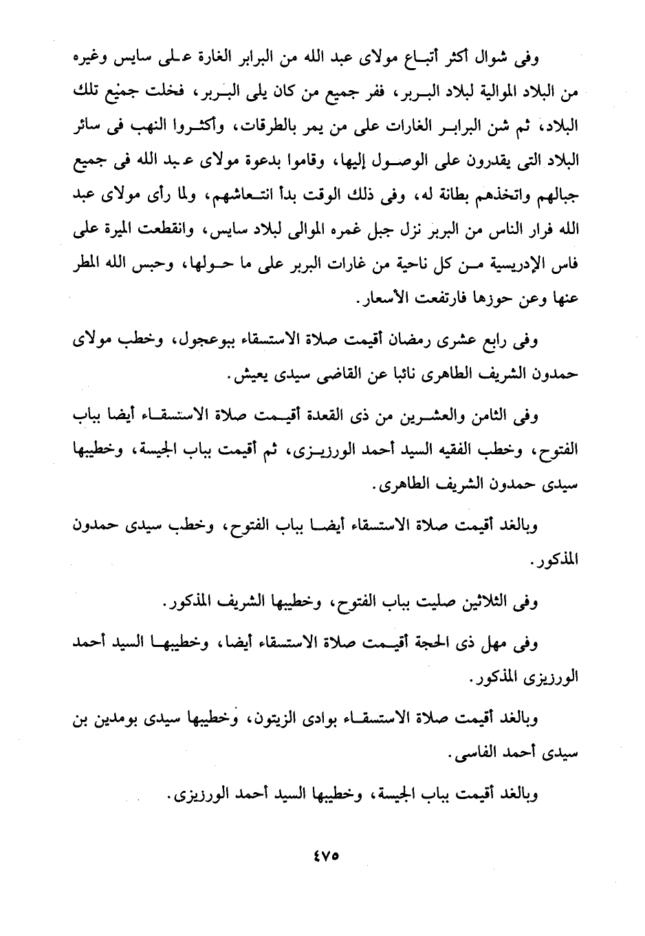 وفى رابع عشرى رمضان أقيمت صلاة الاستسقاء ببوعجول، وخطب مولاى حمدون الشريف الطاهرى نائبا عن القاضي سيدى يعيش.