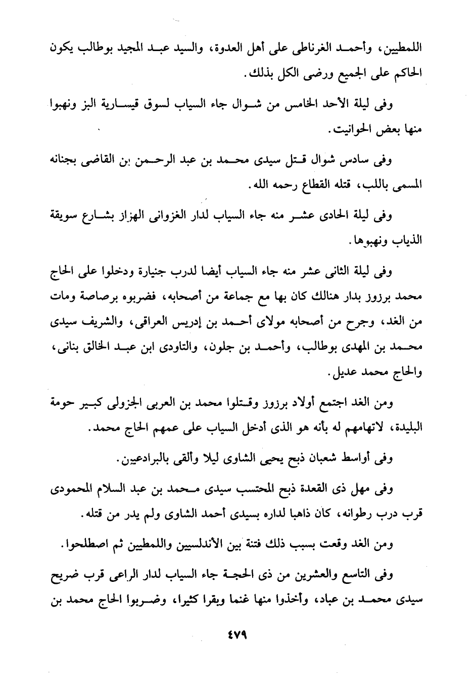 وفى التاسع والعشرين من ذى الحجة جاء السياب لدار الراعى قرب ضريح سيدى محمد بن عباد، وأخذوا منها غنماً وبقراً كثيراً، وضربوا الحاج محمد بن