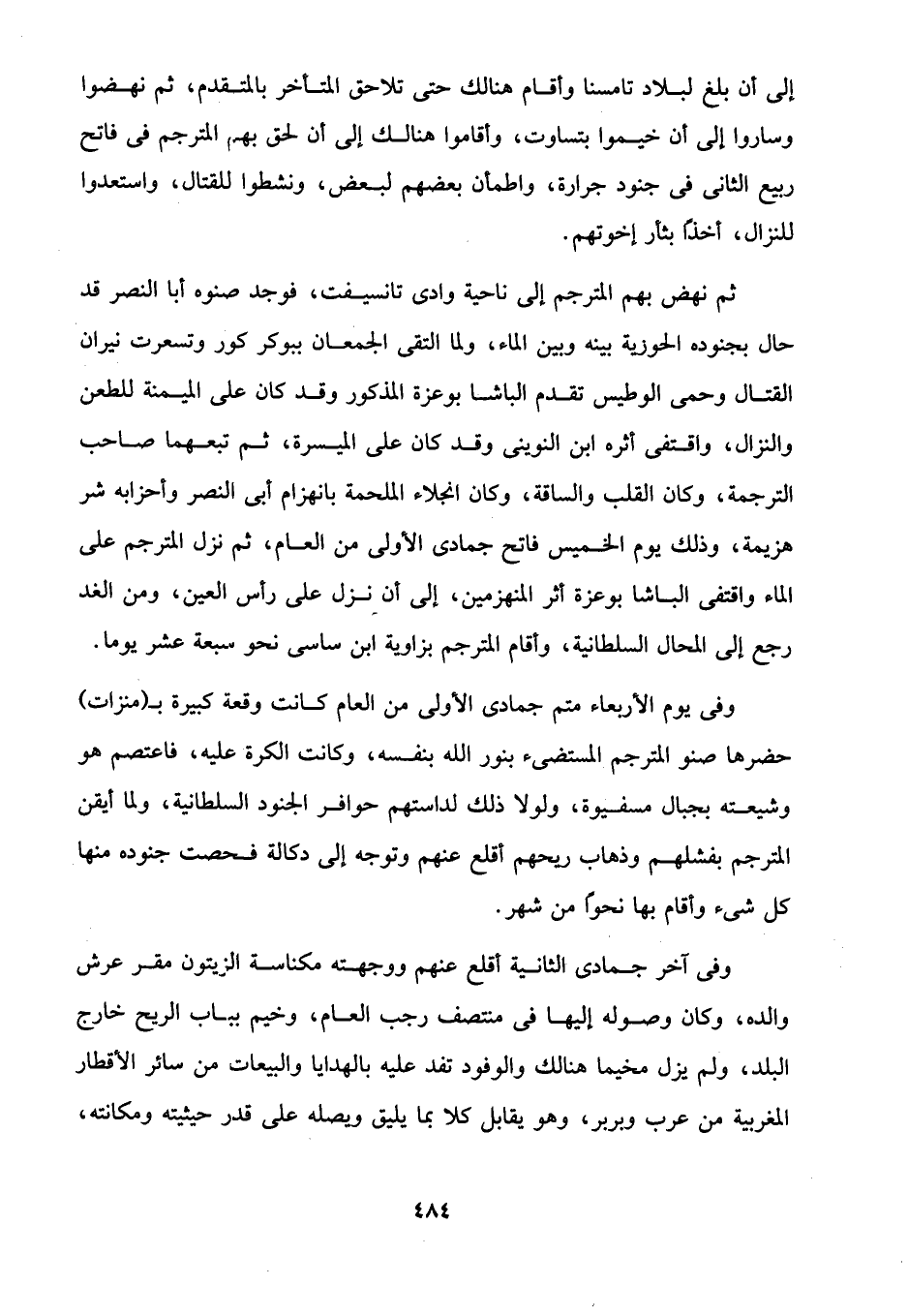 إلى أن بلغ لبلاد تامسنا وأقام هنالك حتَّى تلاحق المتأخر بالمتقدم، ثم نهضوا وساروا إلى أن خيموا بتساوت، وأقاموا هنالك إلى أن لحق بهم المترجم في فاتح ربيع الثَّاني في جنود جرارة، واطمأن بعضهم لبعض، ونشطوا للقتال، واستعدوا للنزال، أخذاً بثأر إخوتهم.