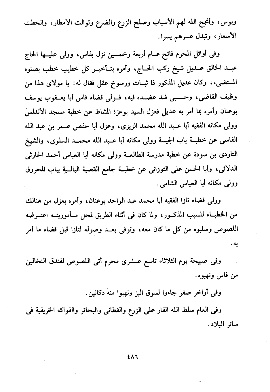 وفى أوائل المحرم فاتح عام أربعة وخمسين نزل بفاس، وولى عليها الحاج عبد الخالق عديل شيخ ركب الحاج، وأمره بتأخير كل خطيب خطب بصنوه المستضئ، وكان عديل المذكور ذا ثبات ورسوخ عقل فقال له: يا مولاى هذا من وظيف القاضى، وحسبى شد عضده فيه، فولى قضاء فاس أبا يعقوب يوصف بوعنان وأمره بما أمر به عديل فعزل السيد بوعزة المشاط عن خطبة مسجد الأندلس وولى مكانه الفقيه أبا عبد الله محمد الزيزى، وعزل أبا حفص عمر بن عبد الله الفاسى عن خطبة باب الجيسة وولى مكانه أبا عبد الله محمد السلوى، والشيخ التاودى بن سودة عن خطبة مدرسة الطالعة وولى مكانه أبا العباس أحمد الحارثى الدلائى، وأبا الحسن على التوزانى عن خطبة جامع القصبة البالية بباب المحروق وولى مكانه أبا العباس الشامى.