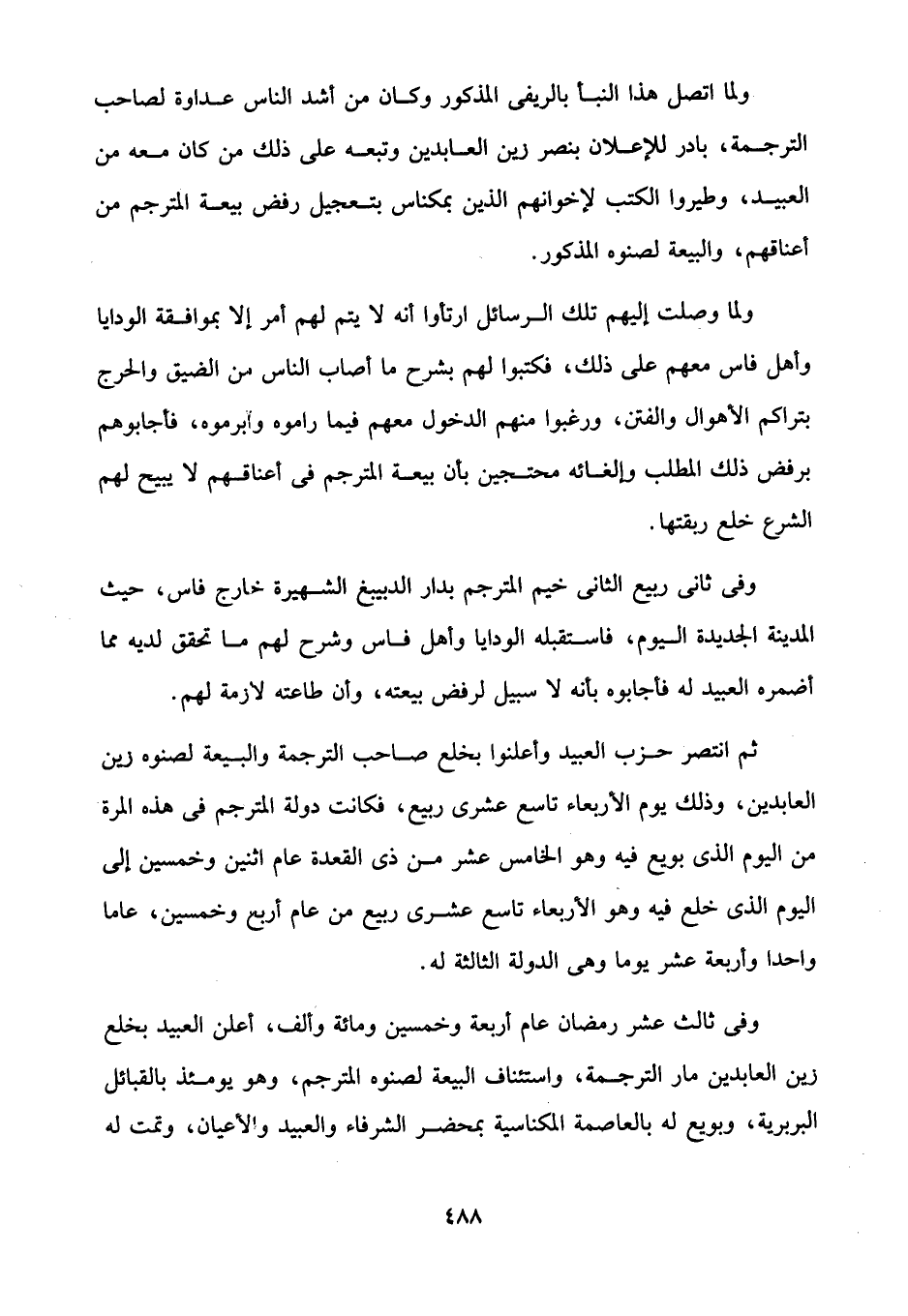 ولما اتصل هذا النبأ بالريفى المذكور وكان من أشد الناس عداوة لصاحب الترجمة، بادر للإعلان بنصر زين العابدين وتبعه على ذلك من كان معه من العبيد، وطيروا الكتب لإخوانهم الذين بمكناس بتعجيل رفض بيعة المترجم من أعناقهم، والبيعة لصنوه المذكور.