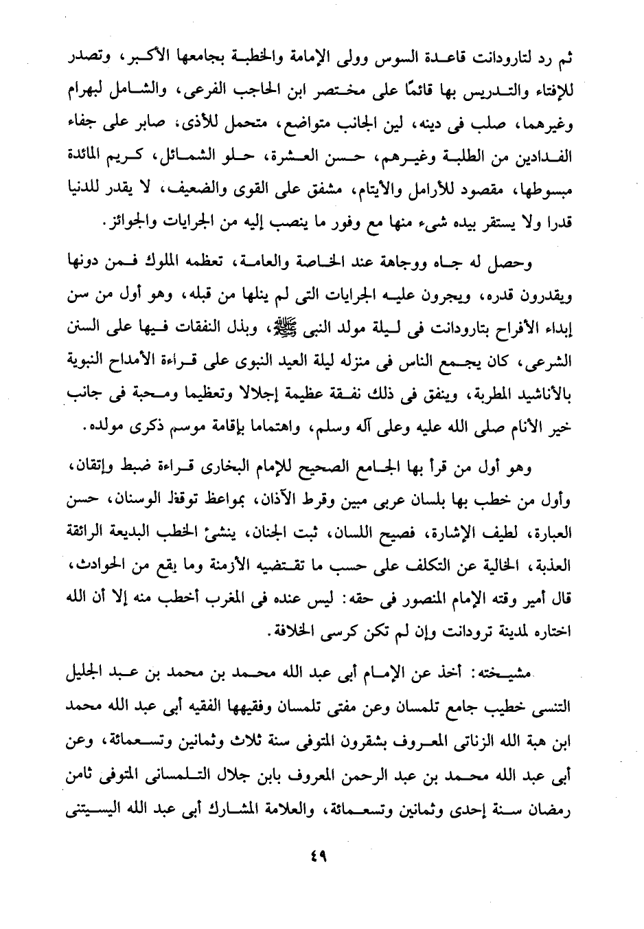 ثم رد لتارودانت قاعدة السوس وولى الإمامة والخطبة بجامعها الأكبر، وتصدر للإفتاء والتدريس بها قائمًا على مختصر ابن الحاجب الفرعى، والشامل لبهرام وغيرهما، صلب في دينه، لين الجانب متواضع، متحمل للأذى؛ صابر على جفاء الفدادين من الطلبة وغيرهم، حسن العشرة، حلو الشمائل، كريم المائدة مبسوطها، مقصود للأرامل والأيتام، مشفق على القوى والضعيف، لا يقدر للدنيا قدرا ولا يستقر بيده شئ منها مع وفور ما ينصب إليه من الجرايات والجوائز.
