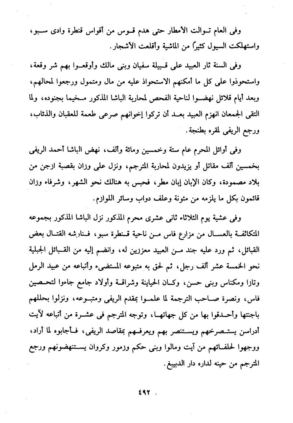 وفى السنة ثار العبيد على قبيلة سفيان وبنى مالك وأوقعوا بهم شر وقعة، واستحوذوا على كل ما أمكنهم الاستحواذ عليه من مال ومتمول ورجعوا لمحالهم، وبعد أيام قلائل نهضوا لناحية الفحص لمحاربة الباشا المذكور مخيما بجنوده، ولما التقى الجمعان انهزم العبيد بعد أن تركوا إخوانهم صرعى طعمة للعقبان والذئاب، ورجع الريفى لمقره بطنجة.