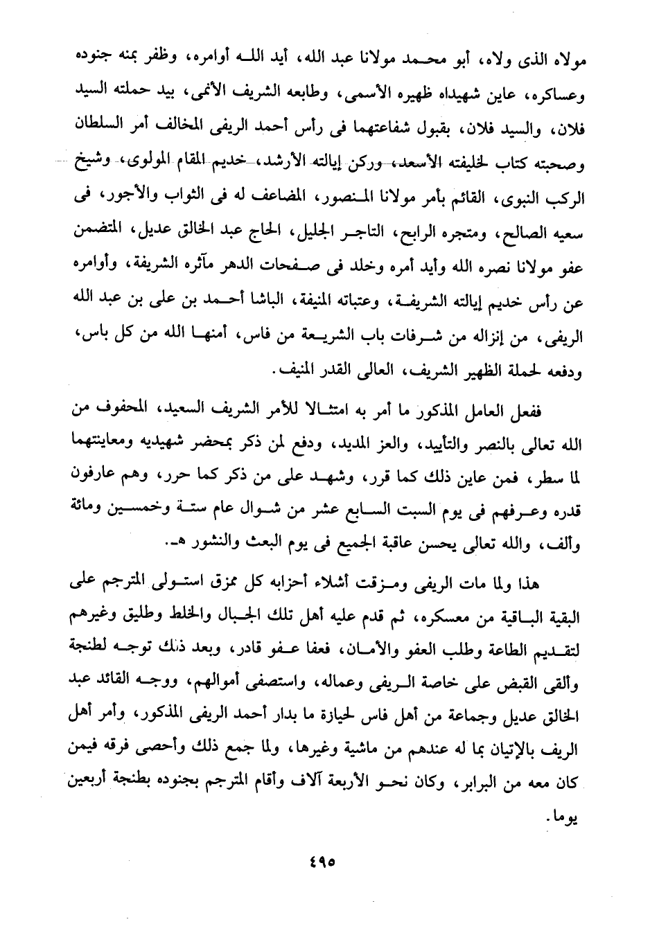 مولاه الذى ولاه، أبو محمد مولانا عبد الله، أيد الله أوامره، وظفر بمنه جنوده وعساكره، عاين شهيداه ظهيره الأسمى، وطابعه الشريف الأنمى، بيد حملته السيد فلان، والسيد فلان، بقبول شفاعتهما في رأس أحمد الريفى المخالف أمر السلطان وصحبته كتاب لخليفته الأسعد، وركن إيالته الأرشد، خديم المقام المولوى، وشيخ الركب النبوى، القائم بأمر مولانا المنصور، المضاعف له في الثواب والأجور، في سعيه الصالح، ومتجره الرابح، التاجر الجليل، الحاج عبد الخالق عديل، المتضمن عفو مولانا نصره الله وأيد أمره وخلد في صفحات الدهر مآثره الشريفة، وأوامره عن رأس خديم إيالته الشريفة، وعتباته المنيفة، الباشا أحمد بن على بن عبد الله الريفى، من إنزاله من شرفات باب الشريعة من فاس، أمنها الله من كل باس، ودفعه لحملة الظهير الشريف، العالى القدر المنيف.