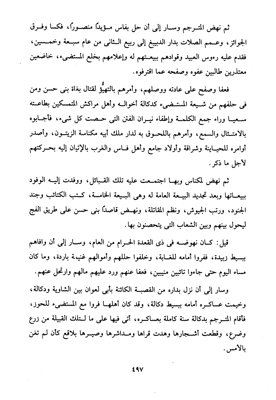 فعفا وصفح على عادته ووصلهم، وأمرهم بالتهيُّؤ لقتال بغاة بنى حسن ومن في حلفهم من شيعة المستضئ كدكالة أخواله وأهل مراكش المتمسكين بطاعته سعيا وراء جمع الكلمة وإطفاء نيران الفتن التي حصت كل شئ، فأجابوه بالامتثال والسمع، وأمرهم باللحوق به لدار ملك أبيه مكناسة الزيتون، وأصدر أوامره للحياينة وشراقة وأولاد جامع وأهل فاس والغرب بالإتيان إليه بحركتهم لأجل ما ذكر.