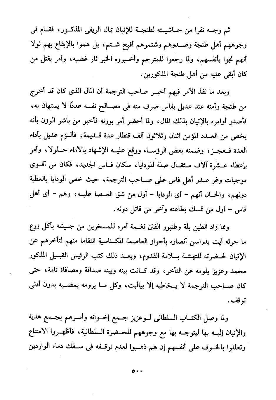 وبعد ما نفذ الأمر فيهم أخبر صاحب الترجمة أن المال الذى كان قد أخرج من طنجة وأمنه عند عديل بفاس صرف منه في مصالح نفسه عدداً لا يستهان به، فأصدر أوامره بالإتيان بذلك المال، ولما أحضر أمر بوزنه فأخبر من باشر الوزن بأنه يخص من العدد المؤمن اثنان وثلاثون ألف قنطار عدة قديمة، فألزم عديل بأداء العدة فعجز، وضمنه بعض الرؤساء ووتع عليه الإشهاد بالأداء حلولا، وأمر بإعطاء عشرة آلاف مثقال صلة للودايا، سكان فاس الجديد، فكان من أقوى موجبات وغر صدر أهل فاس على صاحب الترجمة، حيث خص الودايا بالعطية دونهم، والحال أنهم -أى الودايا- أول من شق العصا عليه، وهم -أى أهل فاس- أول من تمسك بطاعته وآخر من قاتل دونه.
