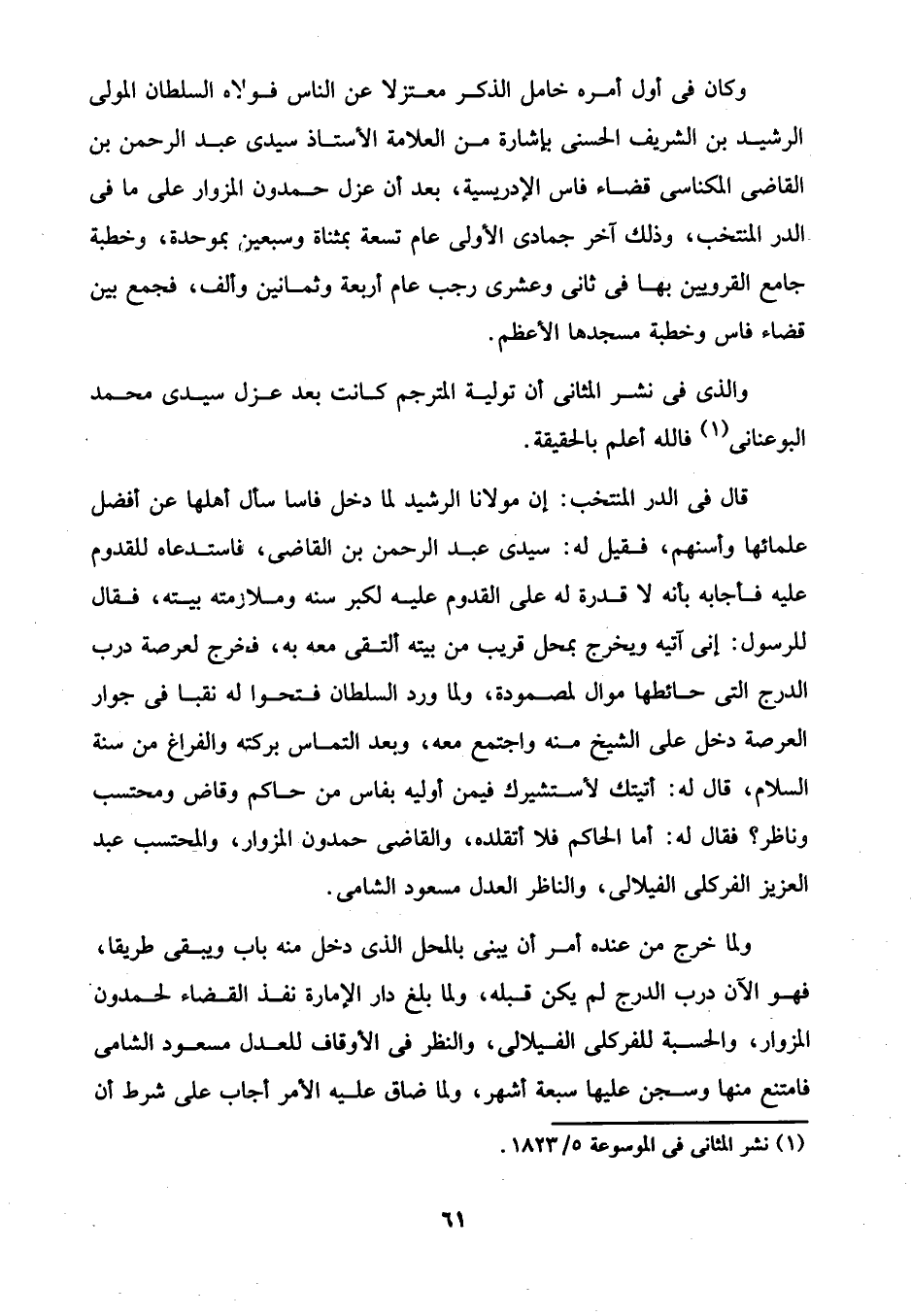 ولما خرج من عنده أمر أن يبني بالمحل الذى دخل منه باب ويبقى طريقا، فهو الآن درب الدرج لم يكن قبله، ولما بلغ دار الإمارة نفذ القضاء لحمدون المزوار، والحسبة للفركلى الفيلالى، والنظر في الأوقاف للعدل مسعود الشامى فامتنع منها وسجن عليها سبعة أشهر، ولما ضاق عليه الأمر أجاب على شرط أن