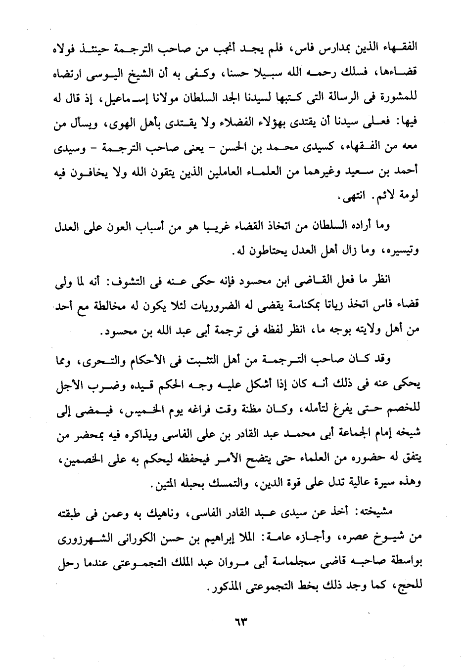 الفقهاء الذين بمدارس فاس، فلم يجد أنجب من صاحب الترجمة حينئذ فولاه قضاءها، فسلك رحمه الله سبيلا حسنا، وكفى به أن الشيخ اليوسى ارتضاه للمشورة في الرسالة التي كتبها لسيدنا الجد السلطان مولانا إسماعيل، إذ قال له فيها: فعلى سيدنا أن يقتدى بهؤلاء الفضلاء ولا يقتدى بأهل الهوى، وشمال من معه من الفقهاء، كسيدى محمد بن الحسن -يعنى صاحب الترجمة- وسيدى أحمد بن سعيد وغيرهما من العلماء العاملين الذين يتقون الله ولا يخافون فيه لومة لائم. انتهى.