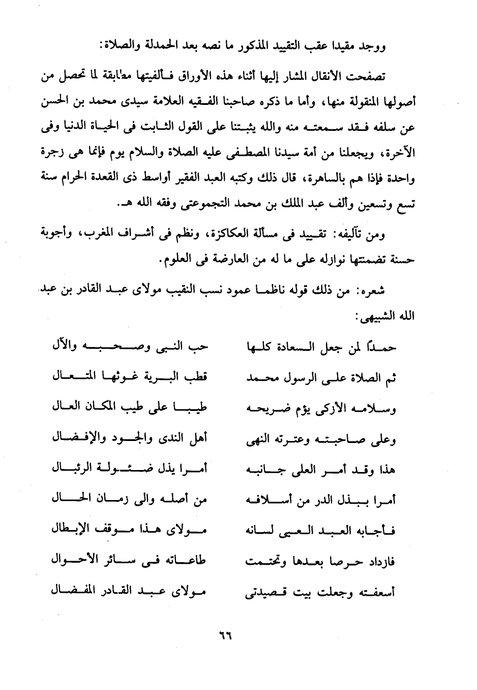 شعره: من ذلك قوله ناظما عمود نسب النقيب مولاى عبد القادر بن عبد الله الشبيهى: