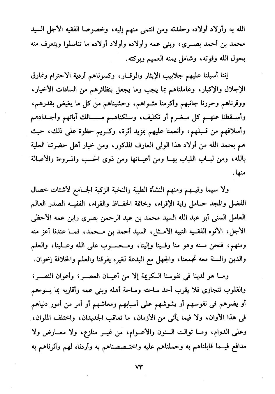 ولا سيما وفيهم ومنهم النشأة الطيبة والنخبة الزكية الجامع لأشتات خصال الفضل والمجد حامل راية الإقراء، وخاتمة الحفاظ والقراء، الفقيه الصدر العالم العامل السنى أبو عبد الله السيد محمد بن عبد الرحمن بصرى وابن عمه الأحظى الأجل، الأنوه الفقيه النبيه الأمثل، السيد أحمد بن محمد، فما عندنا أعز منه ومنهم، فنحن منه وهو منا وفينا وإلينا، ومحسوب على الله وعلينا، والعلم والدين والسنة معه تجمعنا، والجهل مع البدعة لغيره يفرقنا والعلم والخلافة إخوان.