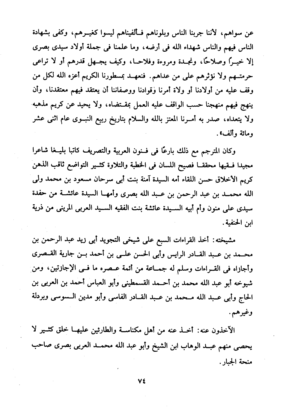 عن سواهم، لأننا جربنا الناس وبلوناهم فألفيناهم ليسوا كغيرهم، وكفى بشهادة الناس فيهم والناس شهداء الله في أرضه، وما علمنا في جملة أولاد سيدي بصرى إلا خيرًا وصلاحًا، ونجدة ومروءة وفلاحا، وكيف يجهل قدرهم أو لا تراعى حرمتهم ولا نؤثرهم على من عداهم. فنعهد بمسطورنا الكريم أعزه الله لكل من وقف عليه من أولادنا أو ولاة أمرنا وقوادنا ووصفاننا أن يعتقد فيهم معتقدنا، وأن ينهج فيهم منهجنا حسب الواقف عليه العمل بمقتضاه، ولا يحيد عن كريم مذهبه ولا يتعداه، صدر به أمرنا المعتز بالله والسلام بتاريخ ربيع النبوى عام اثنى عشر ومائة وألف".