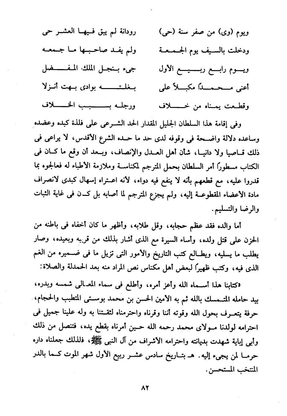 وفى إقامة هذا السلطان الجليل المقدار الحد الشرعى على فلذة كبده وعضده وساعده دلالة واضحة في وقوفه لدى حد ما حده الشرع الأقداس، لا يراعى في ذلك قاصيا ولا دانيا، شأن أهل العدل والإنصاف، وبعد أن وقع ما كان في الكتاب مسطورًا أمر السلطان بحمل المترجم لمكناسة وملازمة الأطباء له فعالجوه بما قدروا عليه، مع قطعهم بأنه لا ينفع فيه دواء، لأنه اعتراه إسهال كبدى لانصراف مادة الأعضاء المقطوعة إليه، ولم يجزع المترجم لما أصابه بل كان في غاية الثبات والرضا والتسليم.