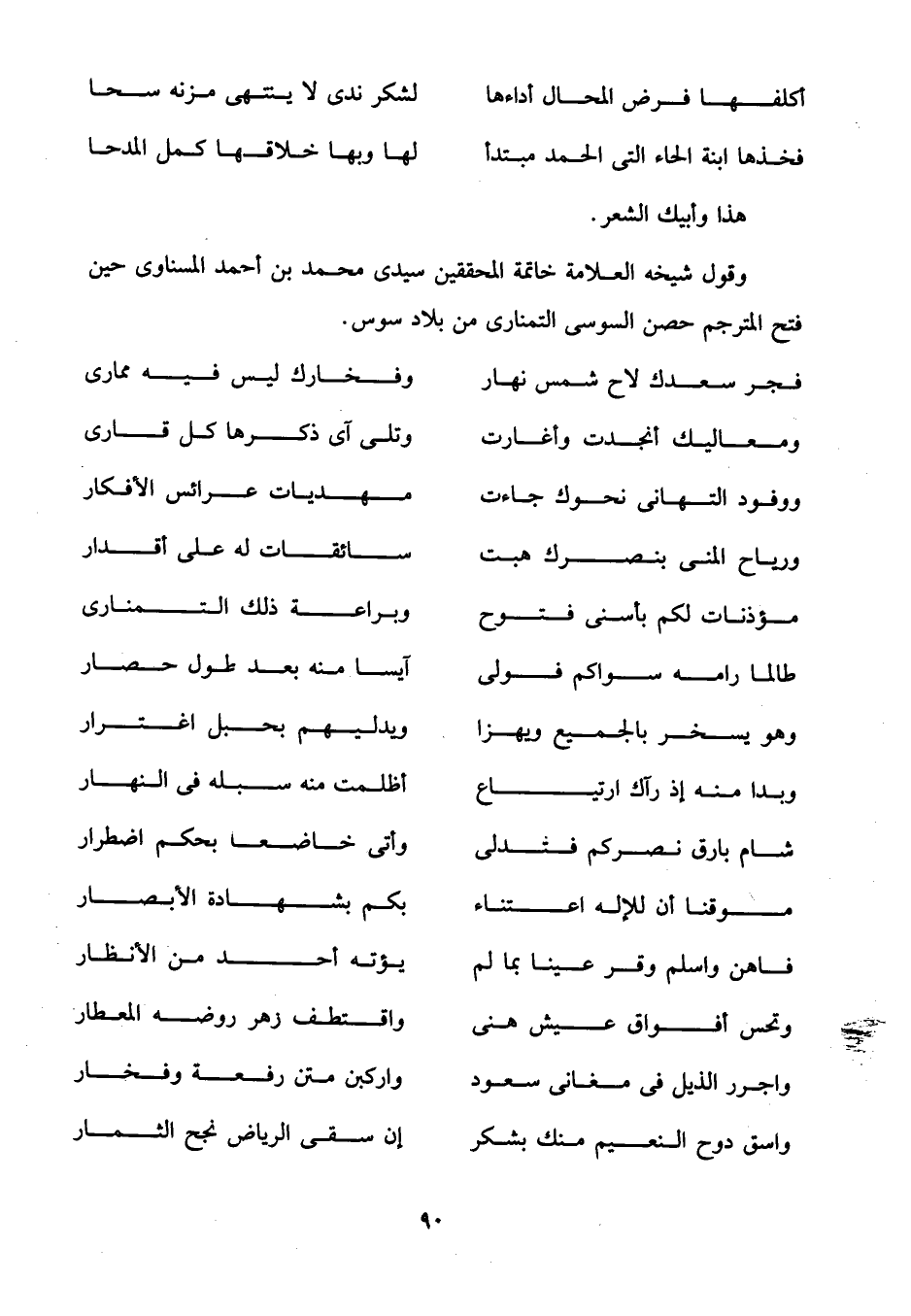 وقول شيخه العلامة خاتمة المحققين سيدى محمد بن أحمد المسناوى حين فتح المترجم حصن السوسى التمنارى من بلاد سوس.