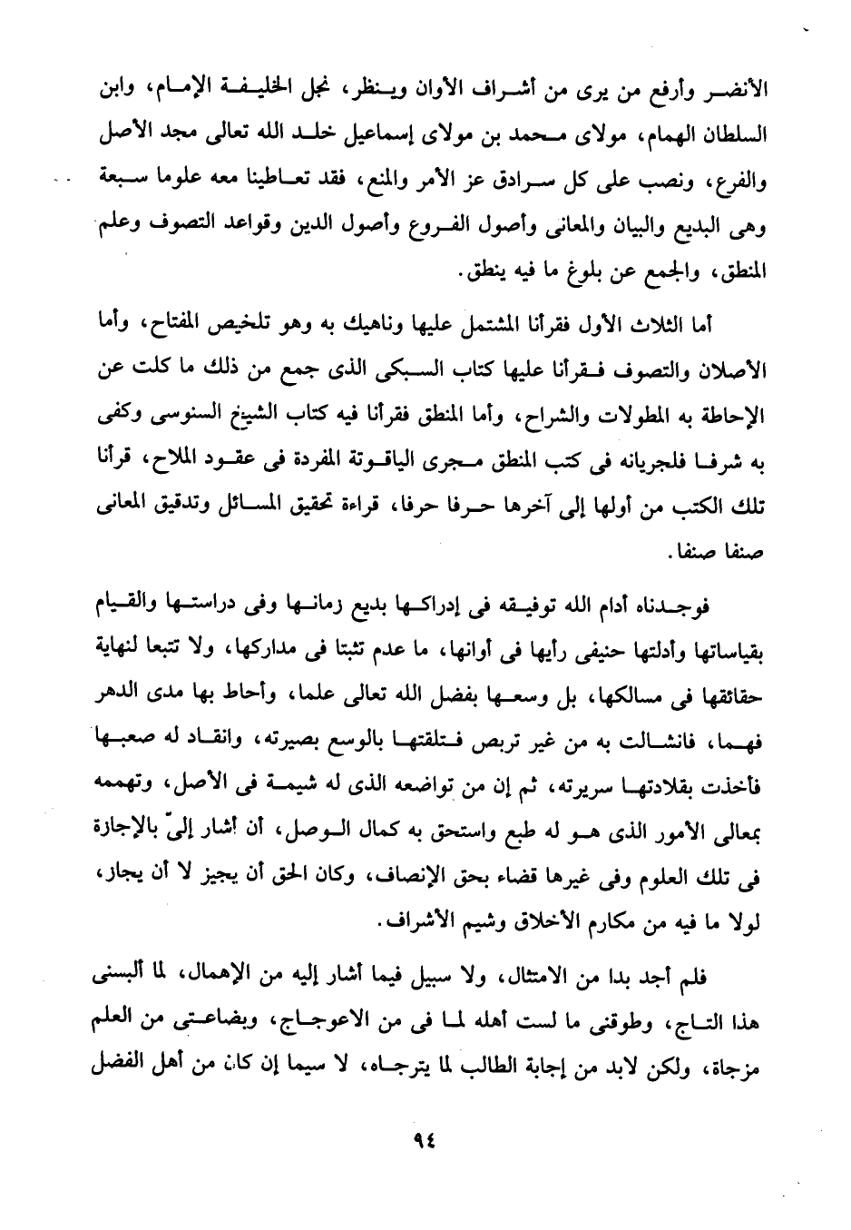 الأنضر وأرفع من يرى من أشراف الأوان وينظر، نجل الخليفة الإمام، وابن السلطان الهمام، مولاى محمد بن مولاى إسماعيل خلد الله تعالى مجد الأصل والفرع، ونصب على كل سرادق عز الأمر والمنع، فقد تعاطينا معه علوما سبعة وهى البديع والبيان والمعانى وأصول الفروع وأصول الدين وقواعد التصوف وعلم المنطق، والجمع عن بلوغ ما فيه ينطق.