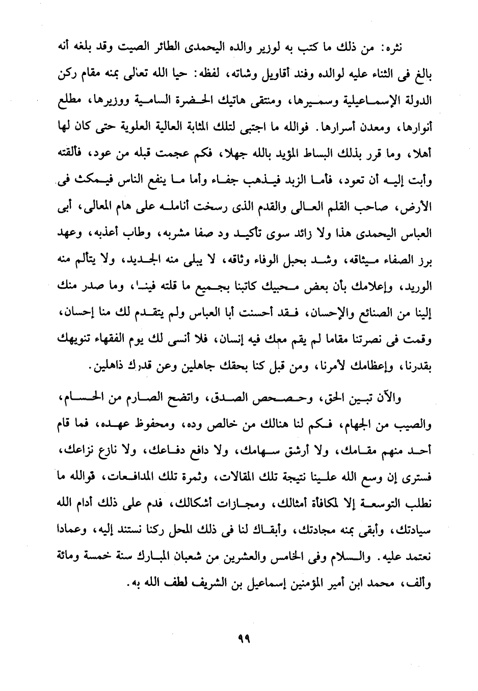 والآن تبين الحق، وحصحص الصدق، واتضح الصارم من الحسام، والصيب من الجهام، فكم لنا هنالك من خالص وده، ومحفوظ عهده، فما قام أحد منهم مقامك، ولا أرشق سهامك، ولا دافع دفاعك، ولا نازع نزاعك، فسترى إن وسع الله علينا نتيجة تلك المقالات، وثمرة تلك المدافعات، فوالله ما نطلب التوسعة إلا لمكافأة أمثالك، ومجازات أشكالك، فدم على ذلك أدام الله سيادتك، وأبقى بمنه مجادتك، وأبقاك لنا في ذلك المحل ركنا نستند إليه، وعمادا نعتمد عليه. والسلام وفى الخامس والعشرين من شعبان المبارك سنة خمسة ومائة وألف، محمد ابن أمير المؤمنين إسماعيل بن الشريف لطف الله به.