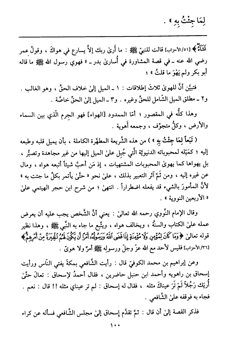 تَشاءُ [51/ الأحزاب] قالت للنبيّ صلى الله عليه وسلم: ما أرى ربك إلّا يسارع في هواك، وقول عمر رضي الله عنه- في قصة المشاورة في أسارى بدر- «فهوي رسول الله صلى الله عليه وسلم ما قاله أبو بكر ولم يهو ما قلت» ؛