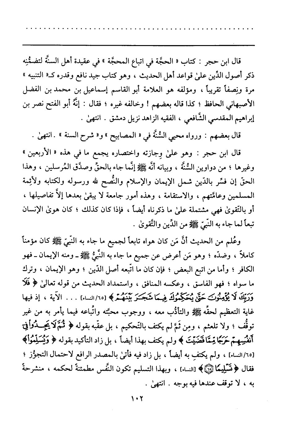 قال ابن حجر: كتاب «الحجّة في اتباع المحجّة» في عقيدة أهل السنّة لتضمّنه ذكر أصول الدّين على قواعد أهل الحديث، وهو كتاب جيد نافع وقدره ك «التنبيه» مرة ونصفا تقريبا، ومؤلفه هو العلامة أبو القاسم إسماعيل بن محمد بن الفضل الأصبهاني الحافظ؛ كذا قاله بعضهم! وخالفه غيره؛ فقال: إنّه أبو الفتح نصر بن إبراهيم المقدسي الشّافعي، الفقيه الزاهد نزيل دمشق. انتهى.