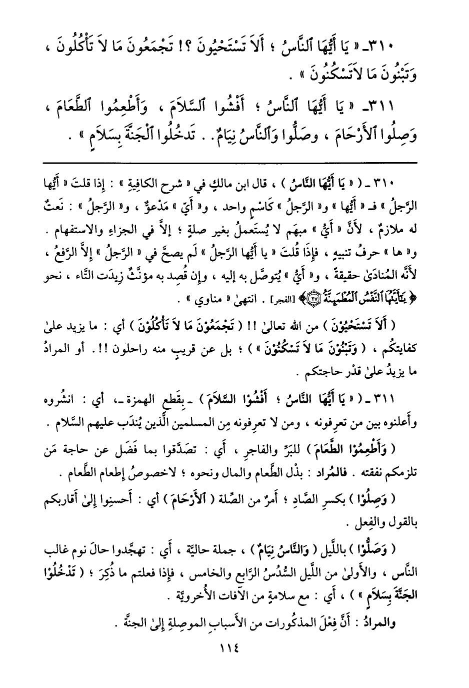 310- ( «يا أيّها النّاس) ، قال ابن مالك في «شرح الكافية» : إذا قلت «أيّها الرّجل» ف «أيّها» و «الرّجل» كاسم واحد، و «أيّ» مدعوّ، و «الرّجل» : نعت له ملازم، لأنّ «أيّ» مبهم لا يستعمل بغير صلة؛ إلّا في الجزاء والاستفهام.