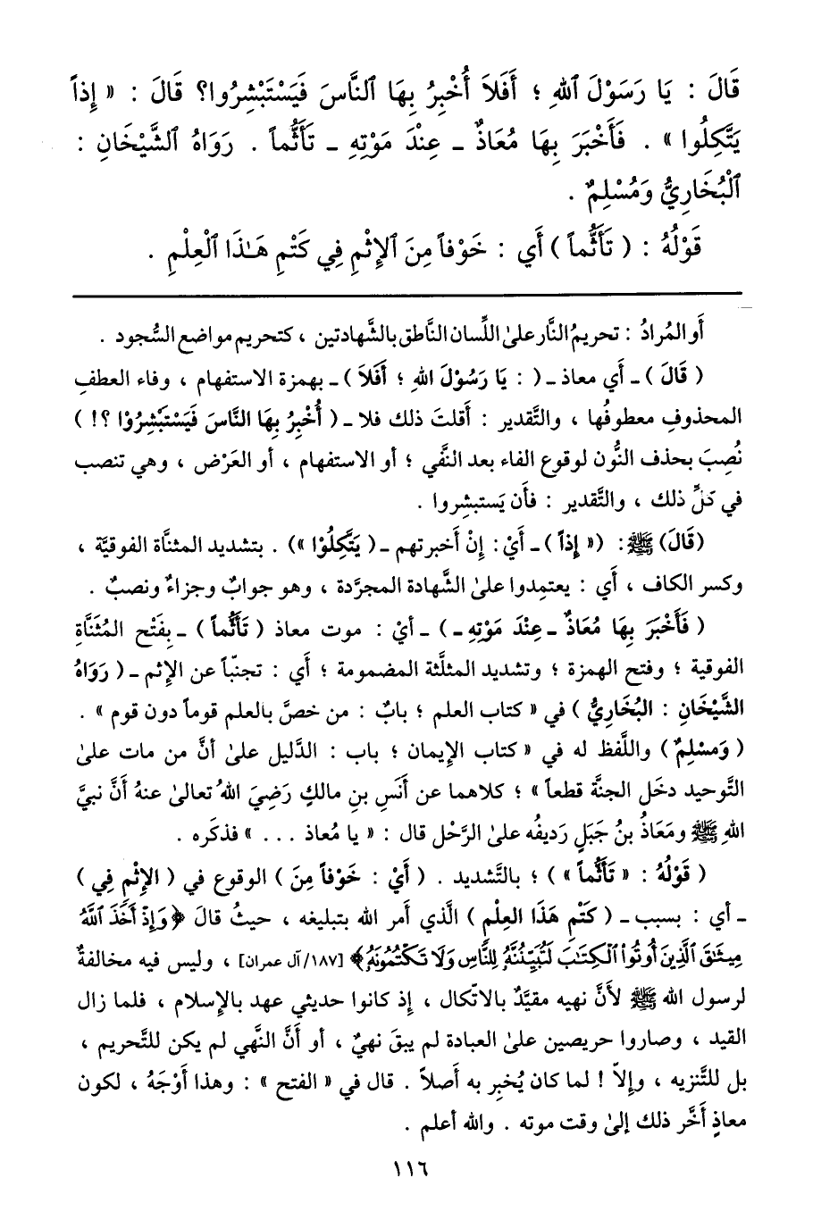 قال: يا رسول الله؛ أفلا أخبر بها النّاس فيستبشروا؟ قال: «إذا يتّكلوا» . فأخبر بها معاذ- عند موته- تأثّما. رواه الشّيخان: