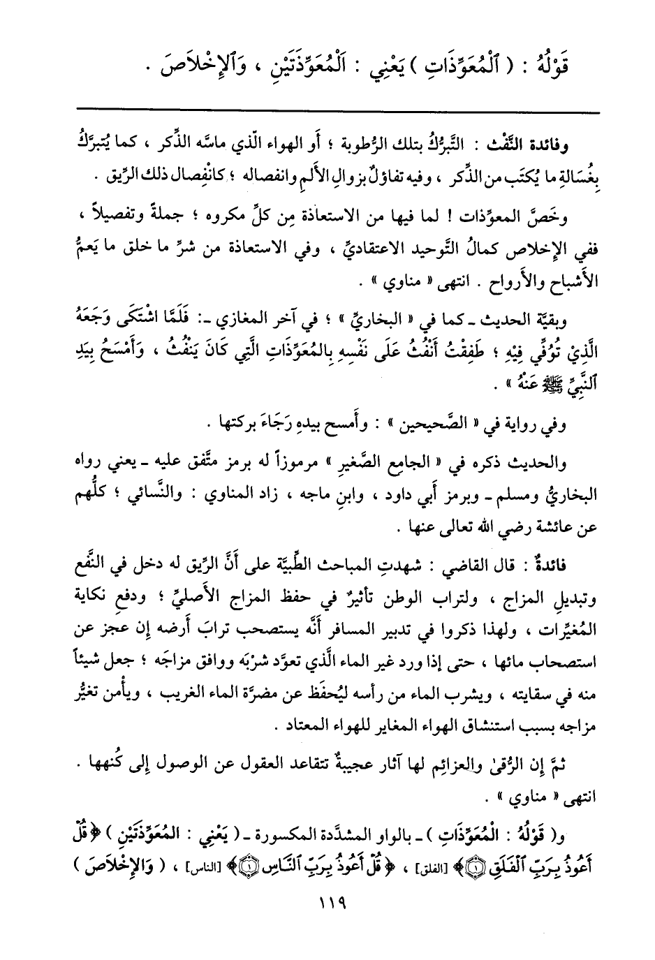 وخصّ المعوّذات! لما فيها من الاستعاذة من كلّ مكروه؛ جملة وتفصيلا، ففي الإخلاص كمال التّوحيد الاعتقاديّ، وفي الاستعاذة من شرّ ما خلق ما يعمّ الأشباح والأرواح. انتهى «مناوي» .