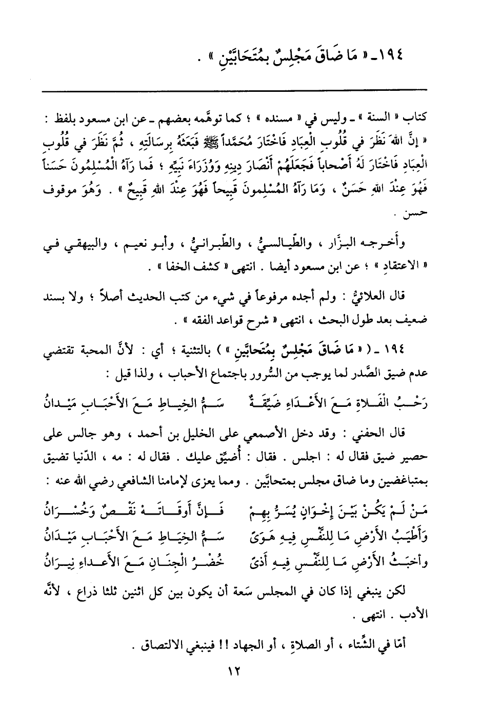 194- ( «ما ضاق مجلس بمتحابّين» ) بالتثنية؛ أي: لأنّ المحبة تقتضي عدم ضيق الصّدر لما يوجب من السّرور باجتماع الأحباب، ولذا قيل: