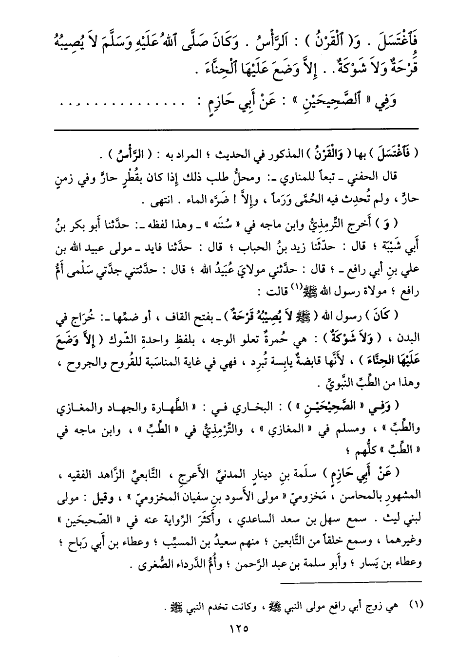 فاغتسل. و (القرن) : الرّأس. وكان صلّى الله عليه وسلّم لا يصيبه قرحة ولا شوكة.. إلّا وضع عليها الحنّاء.
