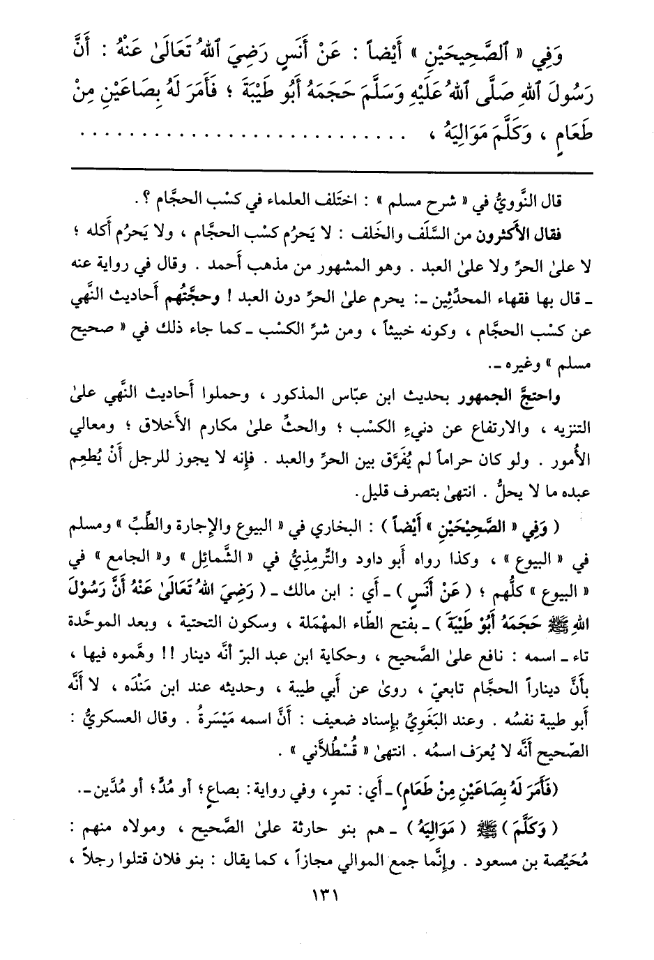 وفي «الصّحيحين» أيضا: عن أنس رضي الله تعالى عنه: أنّ رسول الله صلّى الله عليه وسلّم حجمه أبو طيبة؛ فأمر له بصاعين من طعام، وكلّم مواليه، ...