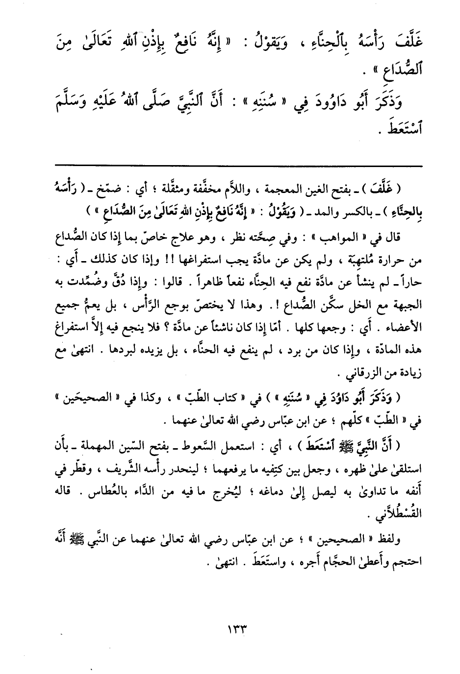 (غلّف) - بفتح الغين المعجمة، واللّام مخفّفة ومثقّلة؛ أي: ضمّخ- (رأسه بالحنّاء) - بالكسر والمد- (ويقول: «إنّه نافع بإذن الله تعالى من الصّداع» )