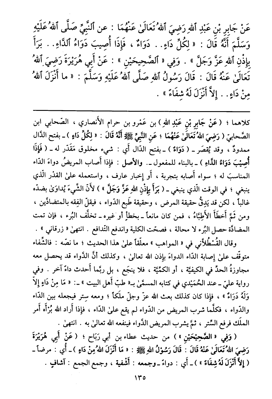 عن جابر بن عبد الله رضي الله تعالى عنهما: عن النّبيّ صلّى الله عليه وسلّم أنّه قال: «لكلّ داء.. دواء، فإذا أصيب دواء الدّاء.. برأ بإذن الله عزّ وجلّ» . وفي «الصّحيحين» : عن أبي هريرة رضي الله تعالى عنه قال: قال رسول الله صلّى الله عليه وسلّم: «ما أنزل الله من داء.. إلّا أنزل له شفاء» .