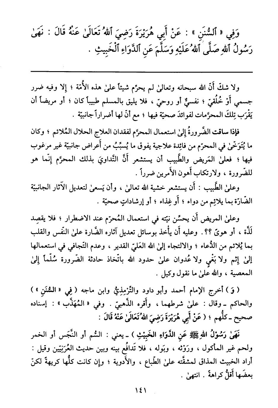 وفي «السّنن» : عن أبي هريرة رضي الله تعالى عنه قال: نهى رسول الله صلّى الله عليه وسلّم عن الدّواء الخبيث.