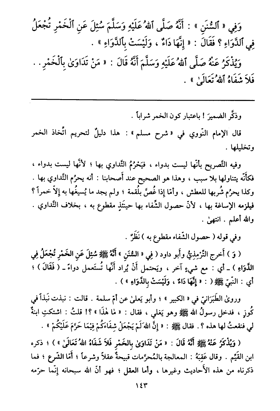 ويذكر عنه صلّى الله عليه وسلّم أنّه قال: «من تداوى بالخمر..