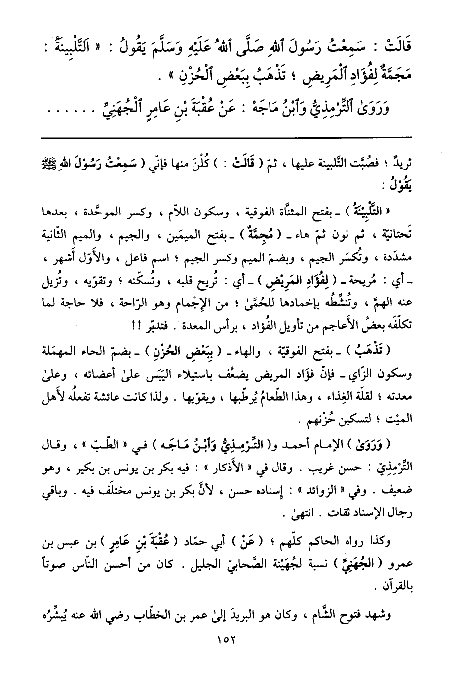«التّلبينة) - بفتح المثنّاة الفوقيّة، وسكون اللّام، وكسر الموحّدة، بعدها تحتانيّة، ثم نون ثمّ هاء- (مجمّة) - بفتح الميمين، والجيم، والميم الثّانية مشدّدة، وتكسر الجيم، وبضمّ الميم وكسر الجيم؛ اسم فاعل، والأوّل أشهر، أي: مريحة- (لفؤاد المريض) - أي: تريح قلبه، وتسكّنه؛ وتقوّيه، وتزيل عنه الهمّ، وتنشّطه بإخمادها للحمّى؛ من الإجمام وهو الرّاحة، فلا حاجة لما تكلّفه بعض الأعاجم من تأويل الفؤاد، برأس المعدة. فتدبّر!!