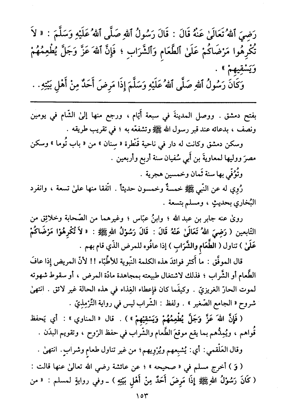 قال الموفّق: ما أكثر فوائد هذه الكلمة النّبوية للأطّبّاء!! لأنّ المريض إذا عاف الطّعام أو الشّراب؛ فذلك لاشتغال طبيعته بمجاهدة مادّة المرض، أو سقوط شهوته لموت الحارّ الغريزيّ. وكيفما كان فإعطاء الغذاء في هذه الحالة غير لائق. انتهى شروح «الجامع الصّغير» . ولفظ: الشّراب ليس في رواية التّرمذيّ.