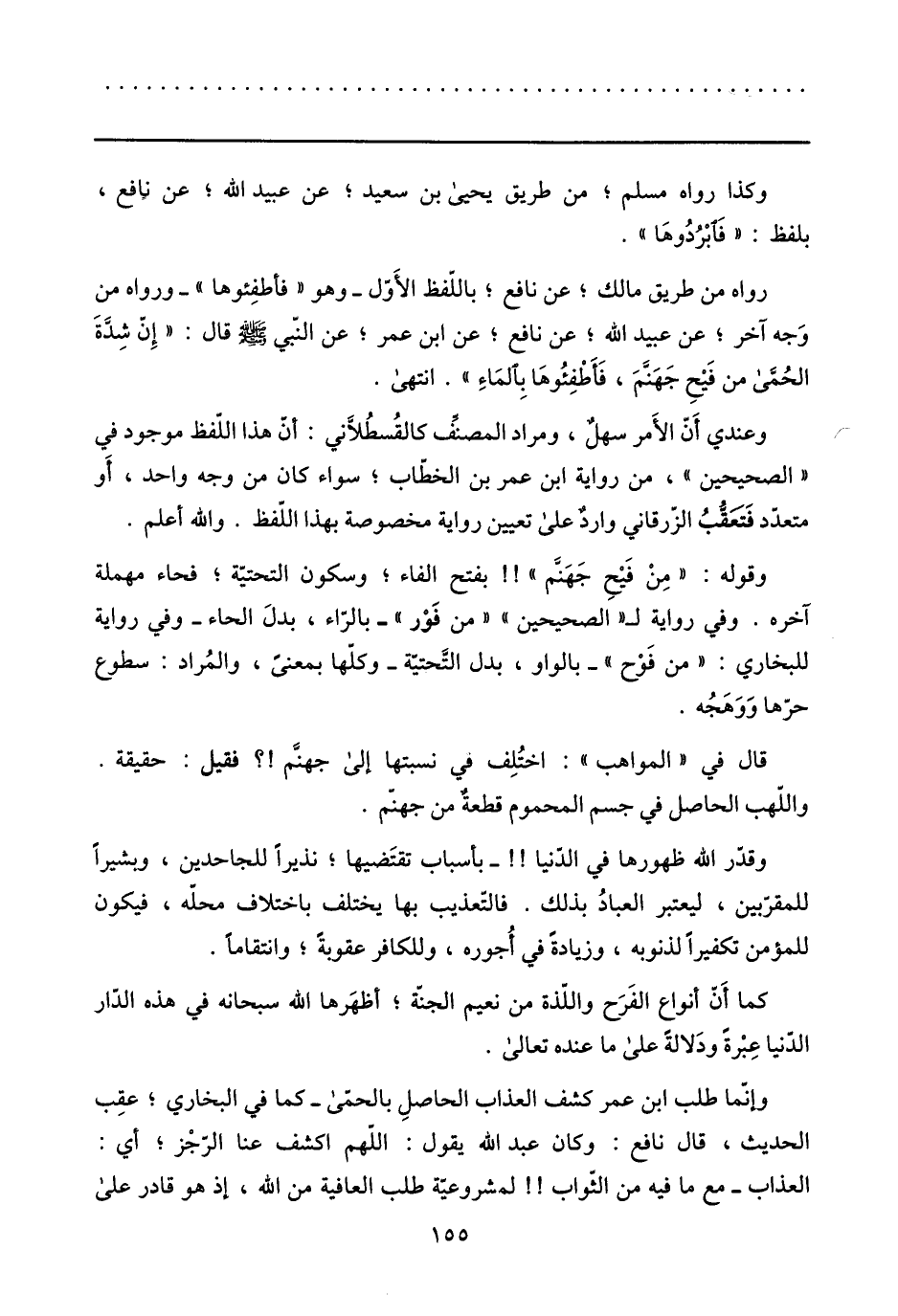 رواه من طريق مالك؛ عن نافع؛ باللّفظ الأوّل- وهو «فأطفئوها» - ورواه من وجه آخر؛ عن عبيد الله؛ عن نافع؛ عن ابن عمر؛ عن النّبيّ صلى الله عليه وسلم قال: «إنّ شدّة الحمّى من فيح جهنّم، فأطفئوها بالماء» . انتهى.