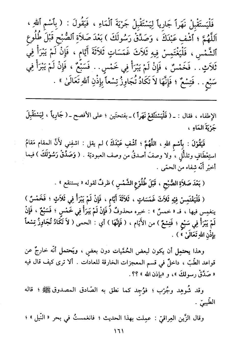 فليستقبل نهرا جاريا ليستقبل جرية الماء، فيقول: (باسم الله، اللهمّ؛ اشف عبدك، وصدّق رسولك) بعد صلاة الصّبح قبل طلوع الشّمس، فليغتمس فيه ثلاث غمسات ثلاثة أيّام، فإن لم يبرأ في ثلاث.. فخمس، فإن لم يبرأ في خمس.. فسبع، فإن لم يبرأ في سبع.. فتسع؛ فإنّها لا تكاد تجاوز تسعا بإذن الله تعالى» .