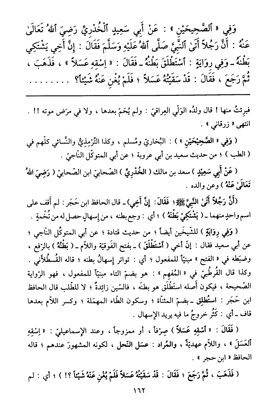 وفي «الصّحيحين» : عن أبي سعيد الخدريّ رضي الله تعالى عنه: أنّ رجلا أتى النّبيّ صلّى الله عليه وسلّم فقال: إنّ أخي يشتكي بطنه- وفي رواية: استطلق بطنه- فقال: «اسقه عسلا» ، فذهب، ثمّ رجع، فقال: قد سقيته عسلا؛ فلم يغن عنه شيئا؟ ...
