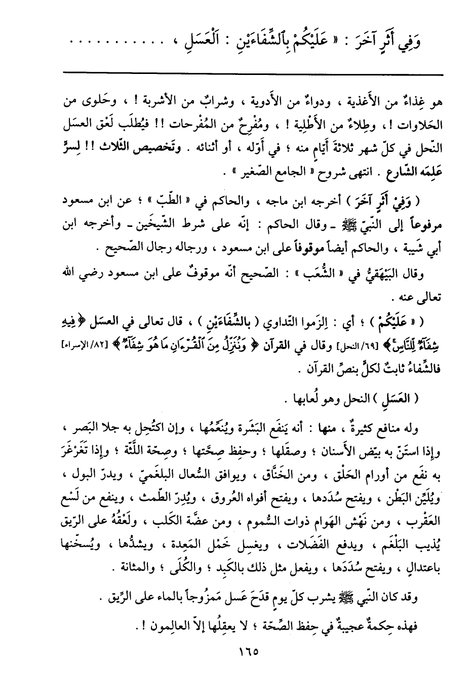 هو غذاء من الأغذية، ودواء من الأدوية، وشراب من الأشربة!، وحلوى من الحلاوات!، وطلاء من الأطلية!، ومفرح من المفرحات!! فيطلب لعق العسل النّحل في كلّ شهر ثلاثة أيّام منه؛ في أوّله، أو أثنائه. وتخصيص الثّلاث!! لسرّ علمه الشّارع. انتهى شروح «الجامع الصّغير» .