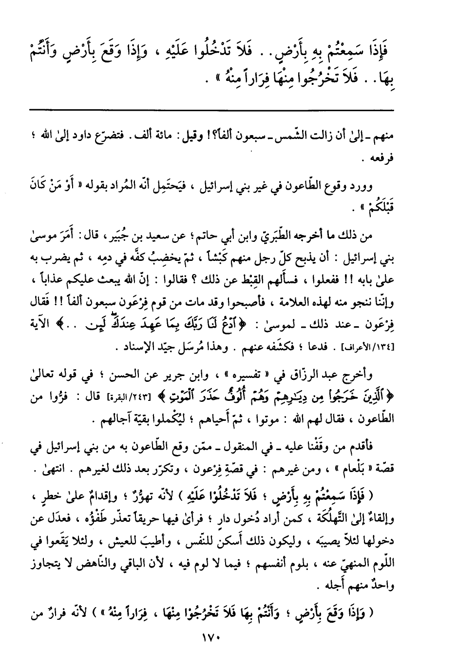 وأخرج عبد الرزّاق في «تفسيره» ، وابن جرير عن الحسن؛ في قوله تعالى الَّذِينَ خَرَجُوا مِنْ دِيارِهِمْ وَهُمْ أُلُوفٌ حَذَرَ الْمَوْتِ [243/ البقرة] قال: فرّوا من الطّاعون، فقال لهم الله: موتوا، ثمّ أحياهم؛ ليكملوا بقيّة آجالهم.