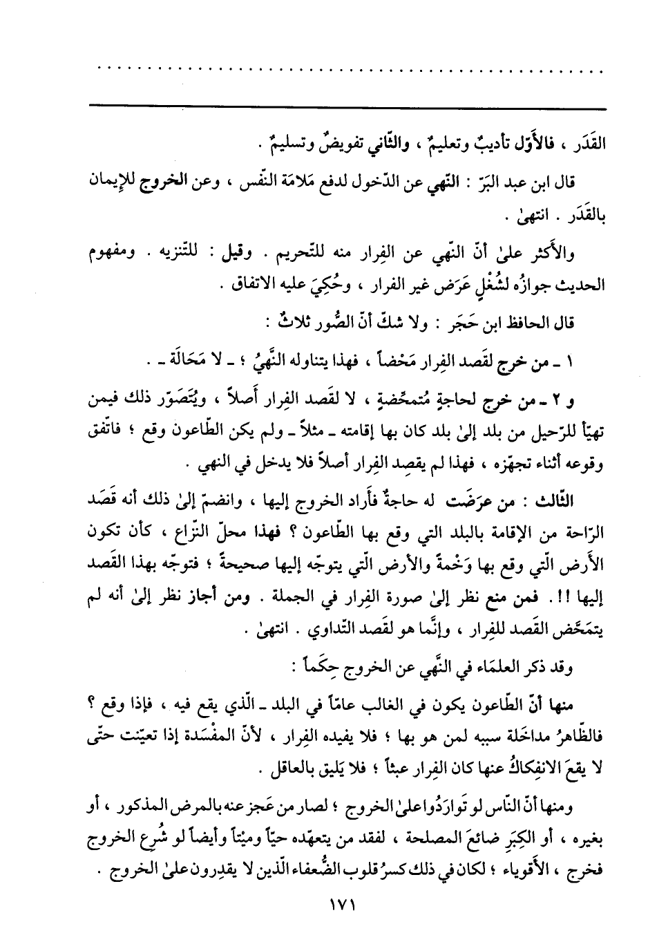 الثّالث: من عرضت له حاجة فأراد الخروج إليها، وانضمّ إلى ذلك أنه قصد الرّاحة من الإقامة بالبلد التي وقع بها الطّاعون؟ فهذا محلّ النّزاع، كأن تكون الأرض الّتي وقع بها وخمة والأرض الّتي يتوجّه إليها صحيحة؛ فتوجّه بهذا القصد إليها!!. فمن منع نظر إلى صورة الفرار في الجملة. ومن أجاز نظر إلى أنه لم يتمحّض القصد للفرار، وإنّما هو لقصد التّداوي. انتهى.