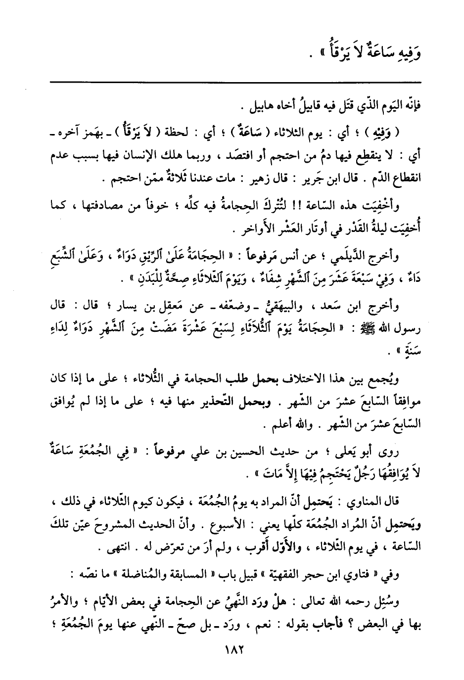 وأخفيت هذه السّاعة!! لتترك الحجامة فيه كلّه؛ خوفا من مصادفتها، كما أخفيت ليلة القدر في أوتار العشر الأواخر.