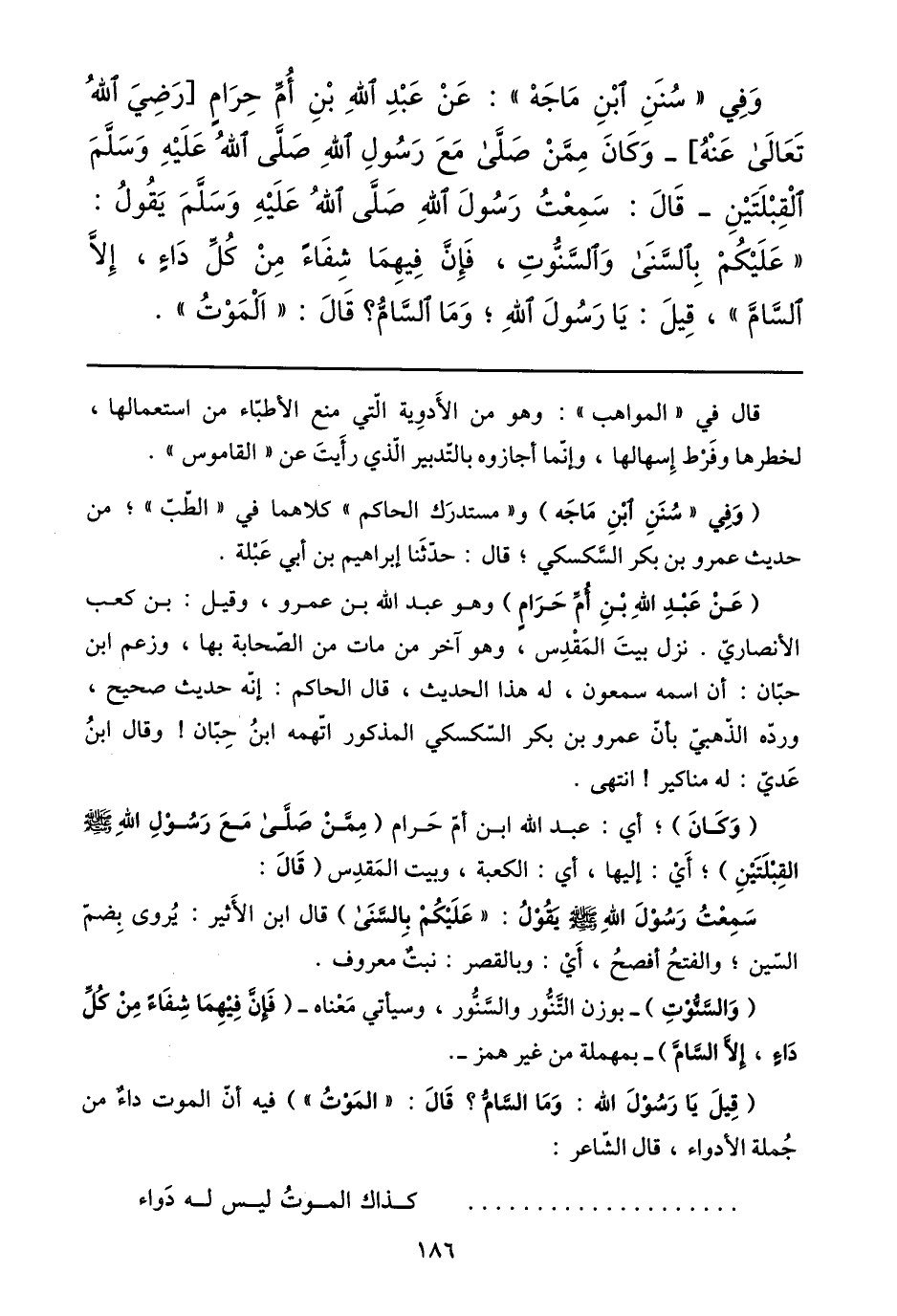 (والسّنّوت) - بوزن التّنّور والسّنّور، وسيأتي معناه- (فإنّ فيهما شفاء من كلّ داء، إلّا السّامّ) - بمهملة من غير همز-.