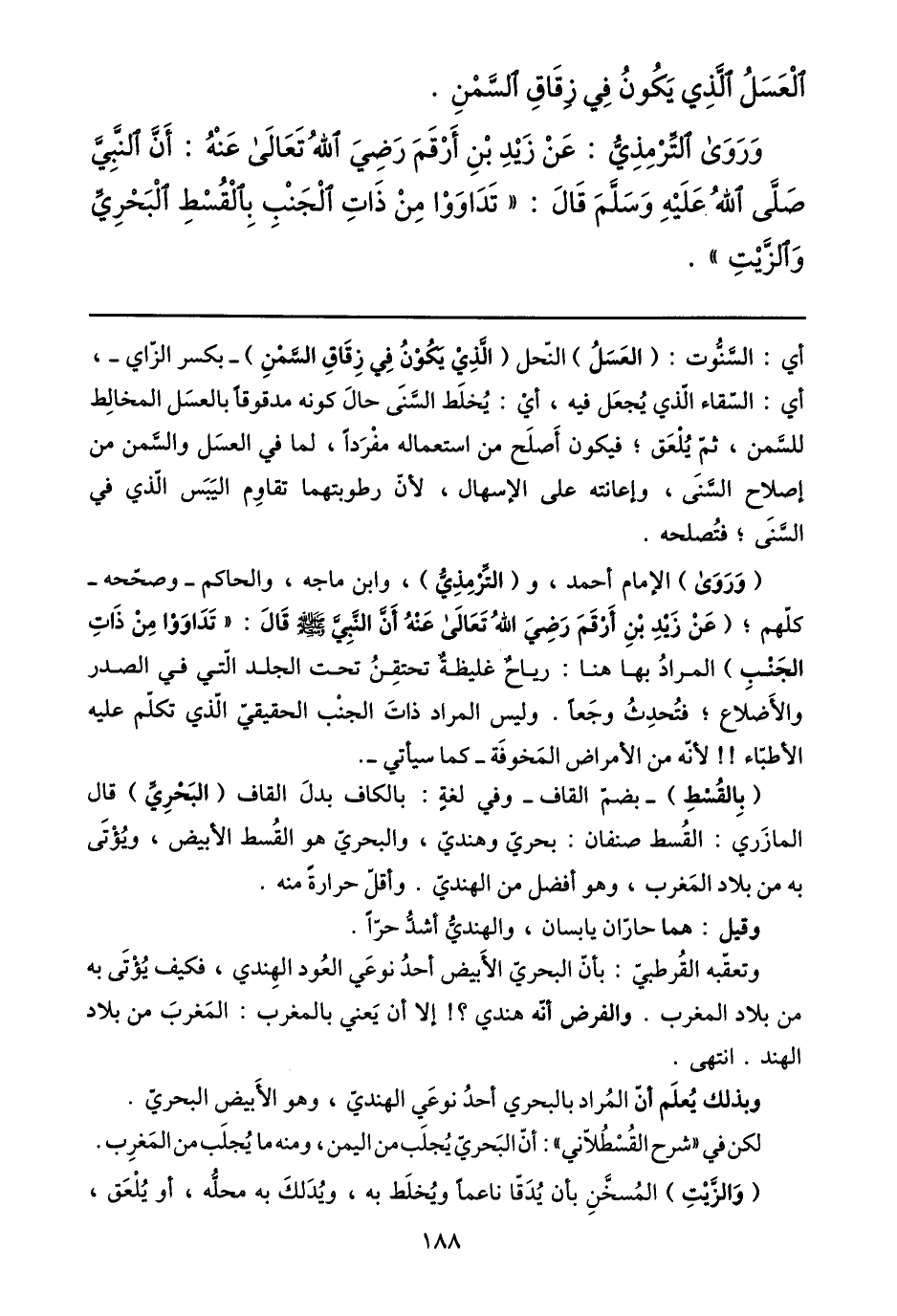 (وروى) الإمام أحمد، و (التّرمذيّ) ، وابن ماجه، والحاكم- وصحّحه- كلّهم؛ (عن زيد بن أرقم رضي الله تعالى عنه أنّ النّبيّ صلى الله عليه وسلم قال: «تداووا من ذات الجنب) المراد بها هنا: رياح غليظة تحتقن تحت الجلد الّتي في الصدر والأضلاع؛ فتحدث وجعا. وليس المراد ذات الجنب الحقيقيّ الّذي تكلّم عليه الأطبّاء!! لأنّه من الأمراض المخوفة- كما سيأتي-.