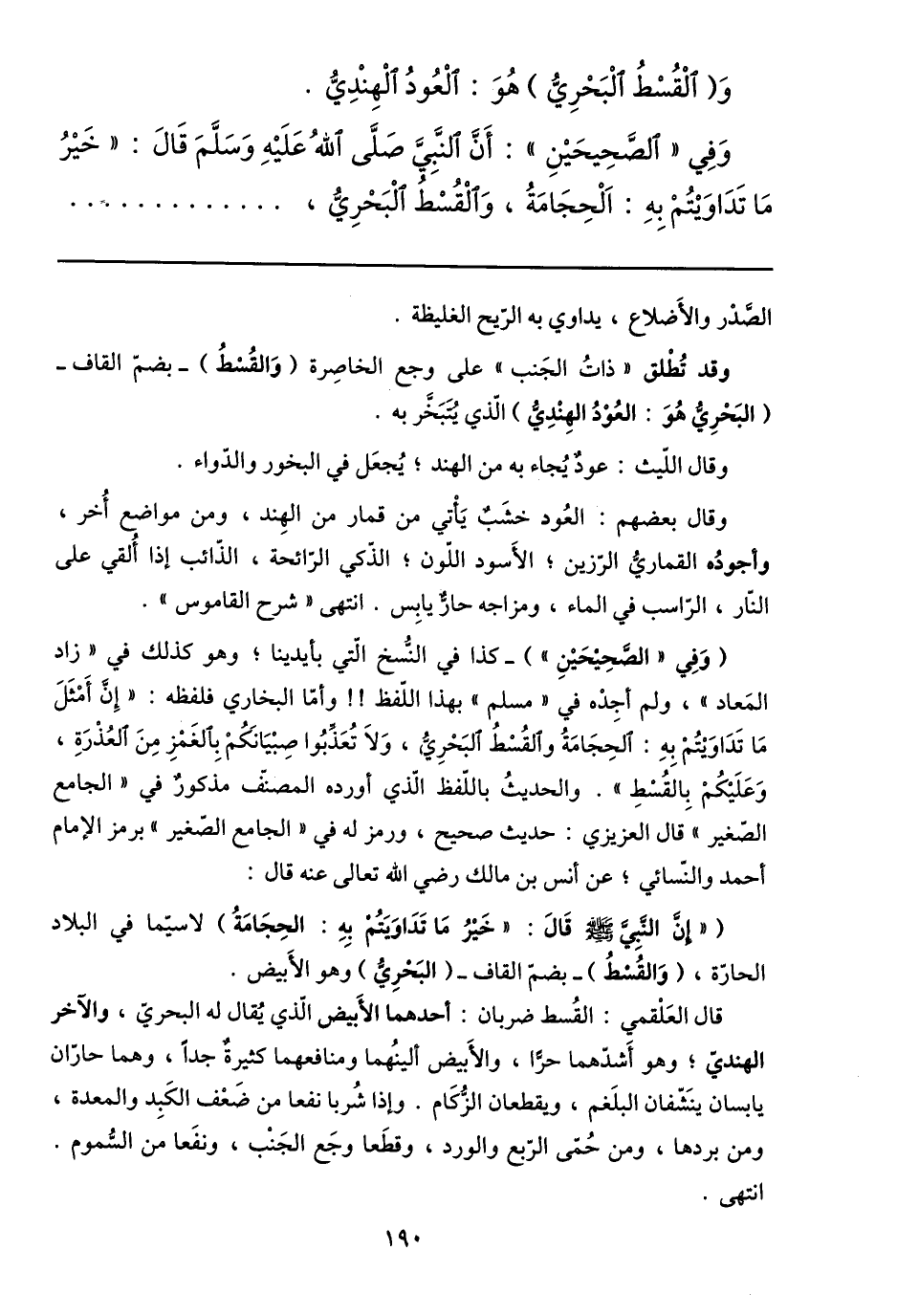 وفي «الصّحيحين» : أنّ النّبيّ صلّى الله عليه وسلّم قال: «خير ما تداويتم به: الحجامة، والقسط البحريّ، ...