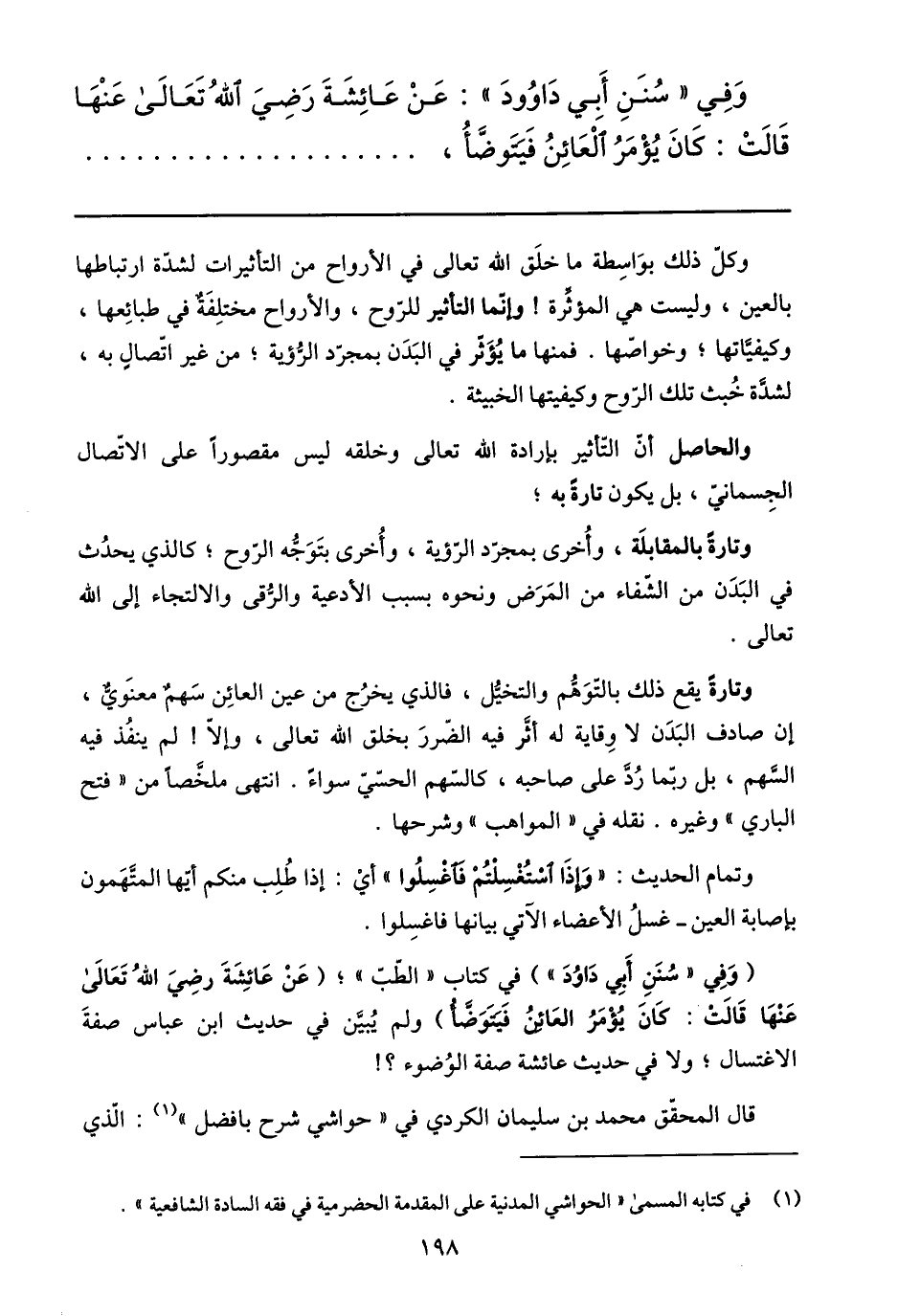 (وفي «سنن أبي داود» ) في كتاب «الطّبّ» ؛ (عن عائشة رضي الله تعالى عنها قالت: كان يؤمر العائن فيتوضّأ) ولم يبيّن في حديث ابن عباس صفة الاغتسال؛ ولا في حديث عائشة صفة الوضوء؟!
