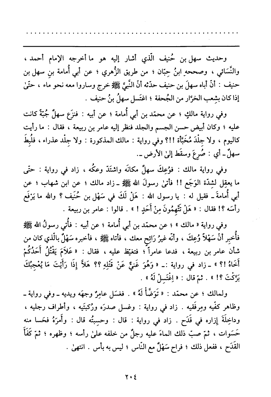 وحديث سهل بن حنيف الّذي أشار إليه هو ما أخرجه الإمام أحمد، والنّسائي، وصححه ابن حبّان؛ من طريق الزّهري؛ عن أبي أمامة بن سهل بن حنيف: أنّ أباه سهل بن حنيف حدّثه أنّ النّبيّ صلى الله عليه وسلم خرج وساروا معه نحو ماء، حتّى إذا كان بشعب الخرّار من الجحفة؛ اغتسل سهل بن حنيف.