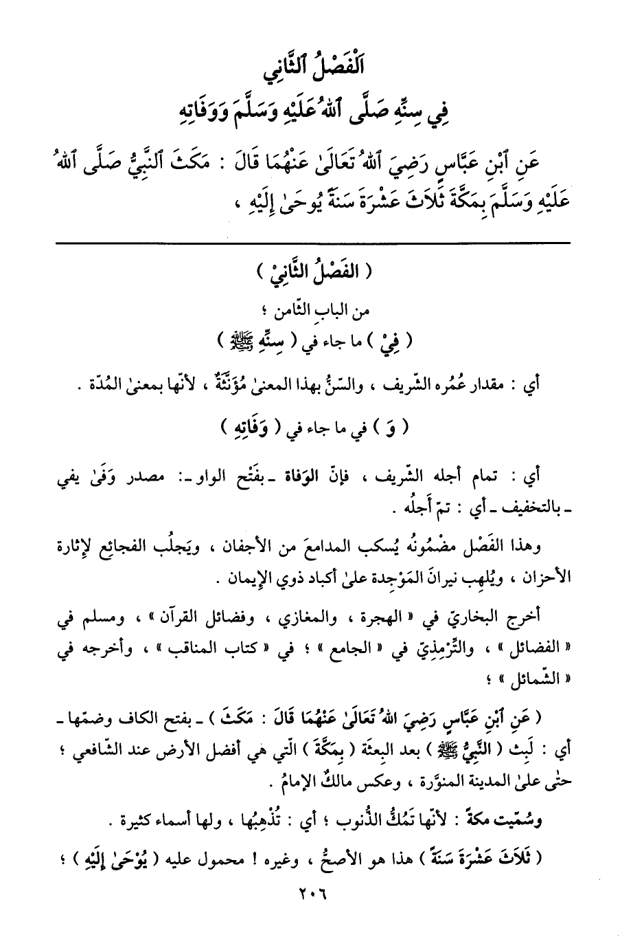 الفصل الثّاني في سنّه صلّى الله عليه وسلّم ووفاته عن ابن عبّاس رضي الله تعالى عنهما قال: مكث النّبيّ صلّى الله عليه وسلّم بمكّة ثلاث عشرة سنة يوحى إليه،
