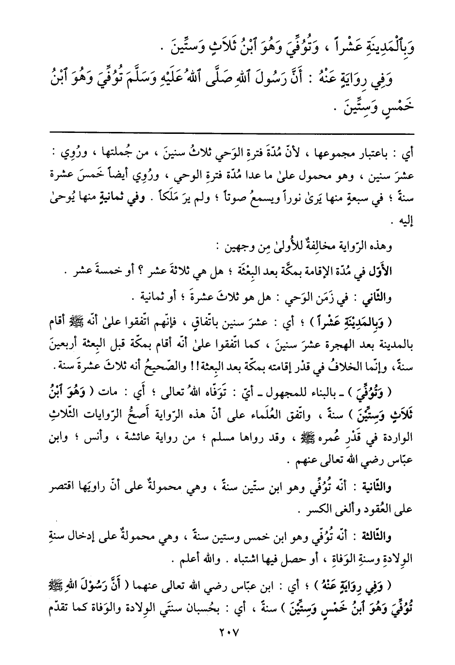(وتوفّي) - بالبناء للمجهول- أيّ: توفّاه الله تعالى؛ أي: مات (وهو ابن ثلاث وستّين) سنة، واتّفق العلماء على أنّ هذه الرّواية أصحّ الرّوايات الثّلاث الواردة في قدر عمره صلى الله عليه وسلم، وقد رواها مسلم؛ من رواية عائشة، وأنس؛ وابن عبّاس رضي الله تعالى عنهم.