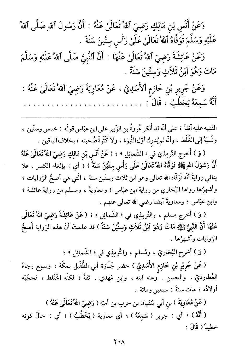 وعن عائشة رضي الله تعالى عنها: أنّ النّبيّ صلّى الله عليه وسلّم مات وهو ابن ثلاث وستّين سنة.