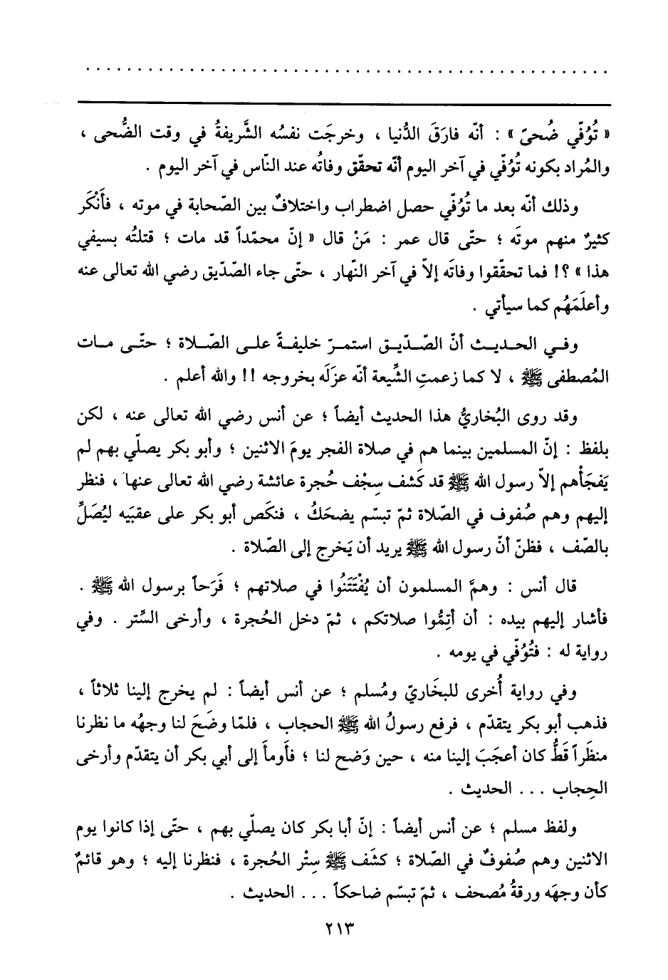 ولفظ مسلم؛ عن أنس أيضا: إنّ أبا بكر كان يصلّي بهم، حتّى إذا كانوا يوم الاثنين وهم صفوف في الصّلاة؛ كشف صلى الله عليه وسلم ستر الحجرة، فنظرنا إليه؛ وهو قائم كأن وجهه ورقة مصحف، ثمّ تبسّم ضاحكا ... الحديث.
