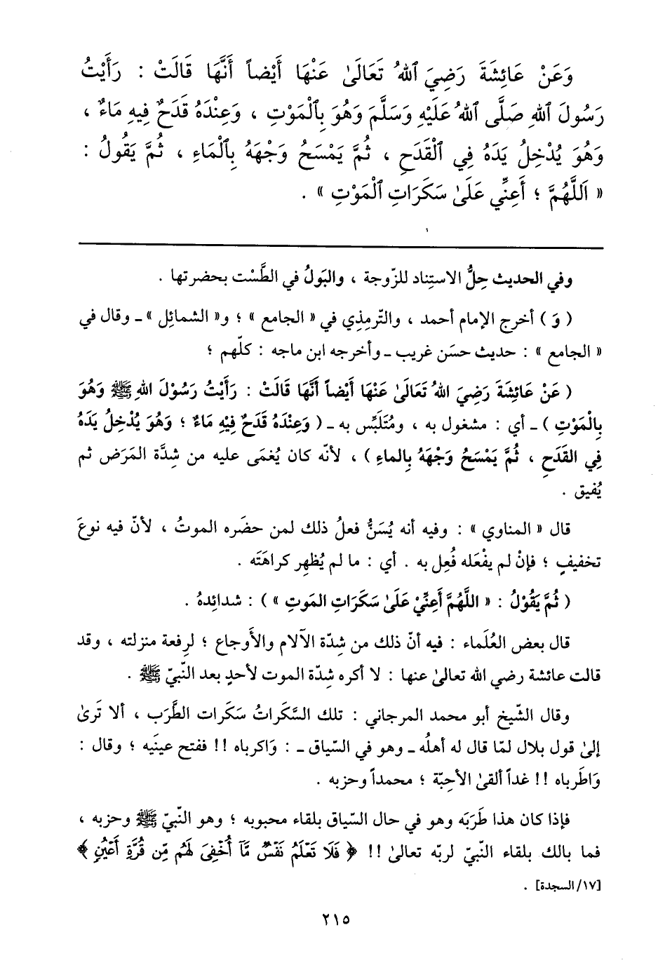 وعن عائشة رضي الله تعالى عنها أيضا أنّها قالت: رأيت رسول الله صلّى الله عليه وسلّم وهو بالموت، وعنده قدح فيه ماء، وهو يدخل يده في القدح، ثمّ يمسح وجهه بالماء، ثمّ يقول: